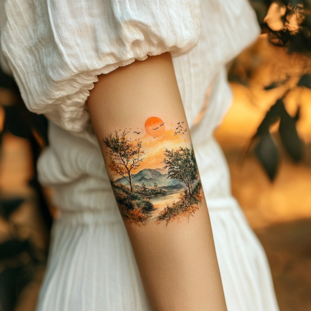 A scenic tattoo featuring mountains, trees, or a sunset can represent adventure, peace, and a connection to nature. Fine line or watercolor styles enhance the artistic appeal.